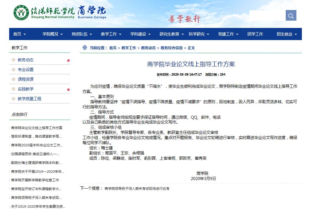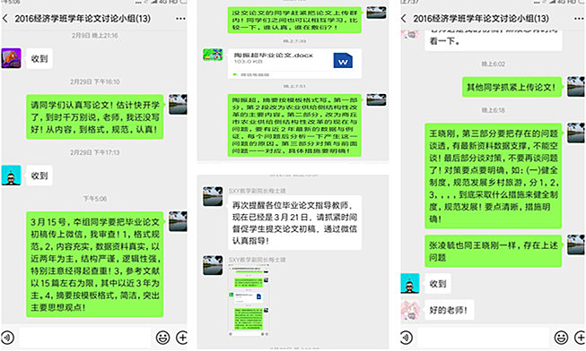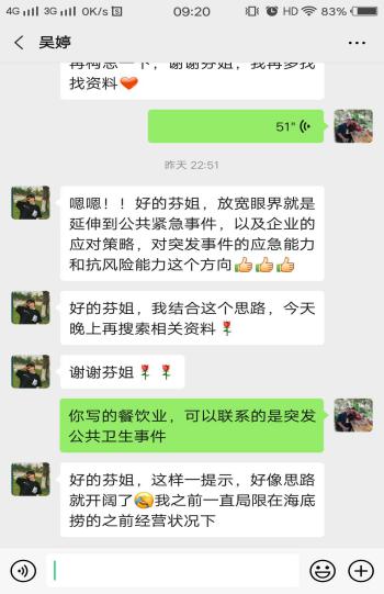 疫情考验责任心,教师们的认真、耐心、细致的指导赢得员工的敬佩与点赞。2016经济学王晓刚同学说:梅老师在微信上不厌其烦的指导我开题,反复讨论论文框架,为我提供最新的参考文献,让我为梅老师的敬业精神深深感动。我决心认真写好毕业论文,不辜负老师希望。目前论文初稿已经写好。2016市场营销吴婷同学说:芬姐(徐志芬)将我们的论文和疫情相结合,指导我们找出疫情对企业营销的影响,一方面保证了论文选题的新颖,写作内容的与时俱进,另一方面又从实践角度加深了我们对疫情影响的理解,拓宽了我们的写作思路,犹如醍醐灌顶。