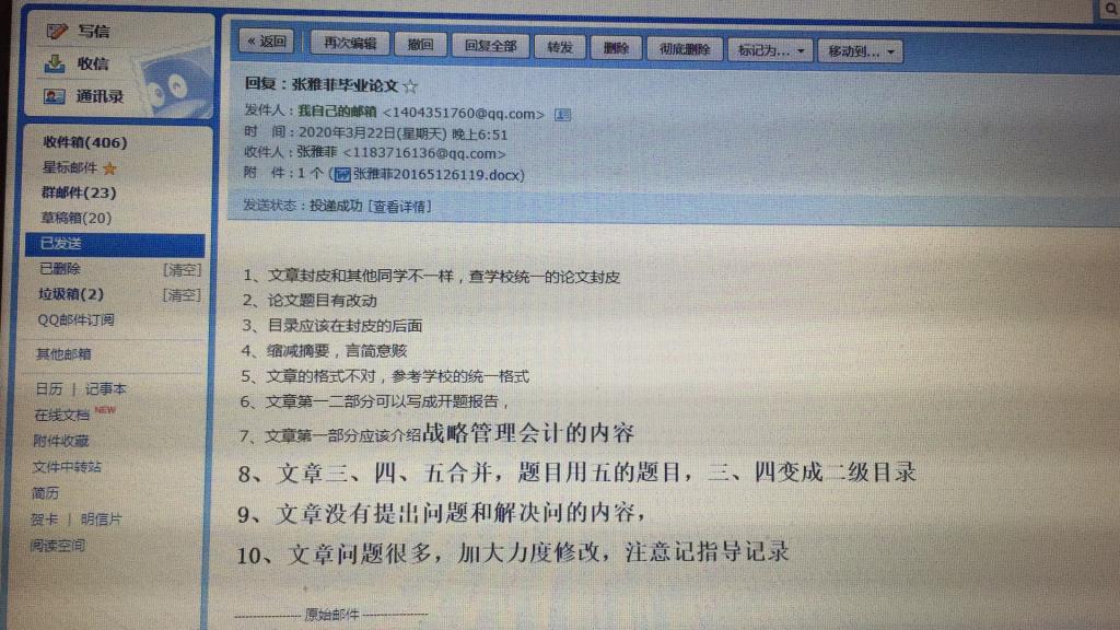 王珍教授利用电话与员工就毕业论文选题及写作框架进行沟通,提高了学生论文的写作效率。通过电子邮箱、微信等方式对员工的开题报告和论文初稿进行指导,将具体的修改意见及时发送给员工。目前大部分员工已经完成初稿。