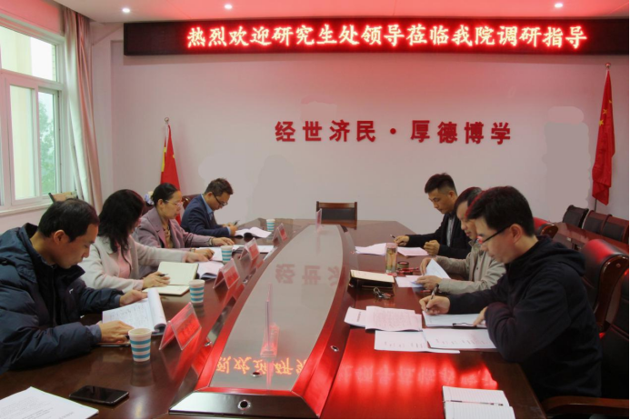 10月20日,研究生处处长沈文慧带领研究生处相关负责人来公司调研指导工商管理一级学科硕士学位授权点专项评估工作,公司经理彭荣胜、副经理俞彤晖、工商管理系主任上官绪明、研究生工作秘书何凤参加会议。