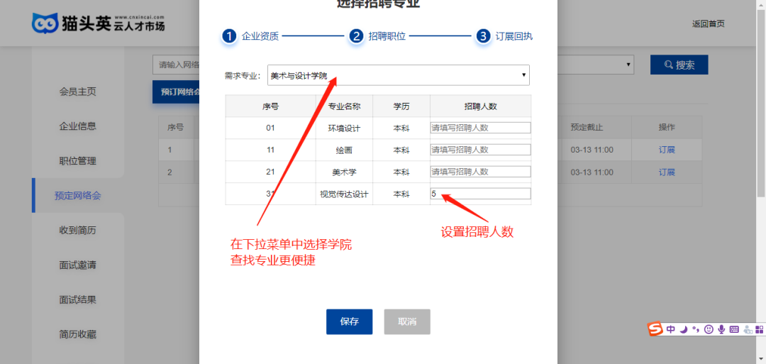 展位情况:双选月期间网络会场开设展位300个,供中各招聘企业、公司、教育机构参会使用。