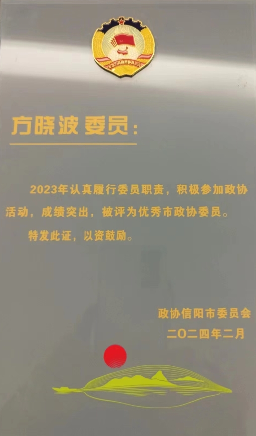 近日,信阳市政协六届二次会议对2023年度优秀市政协委员进行了表彰,伟德方晓波博士获得该项荣誉。