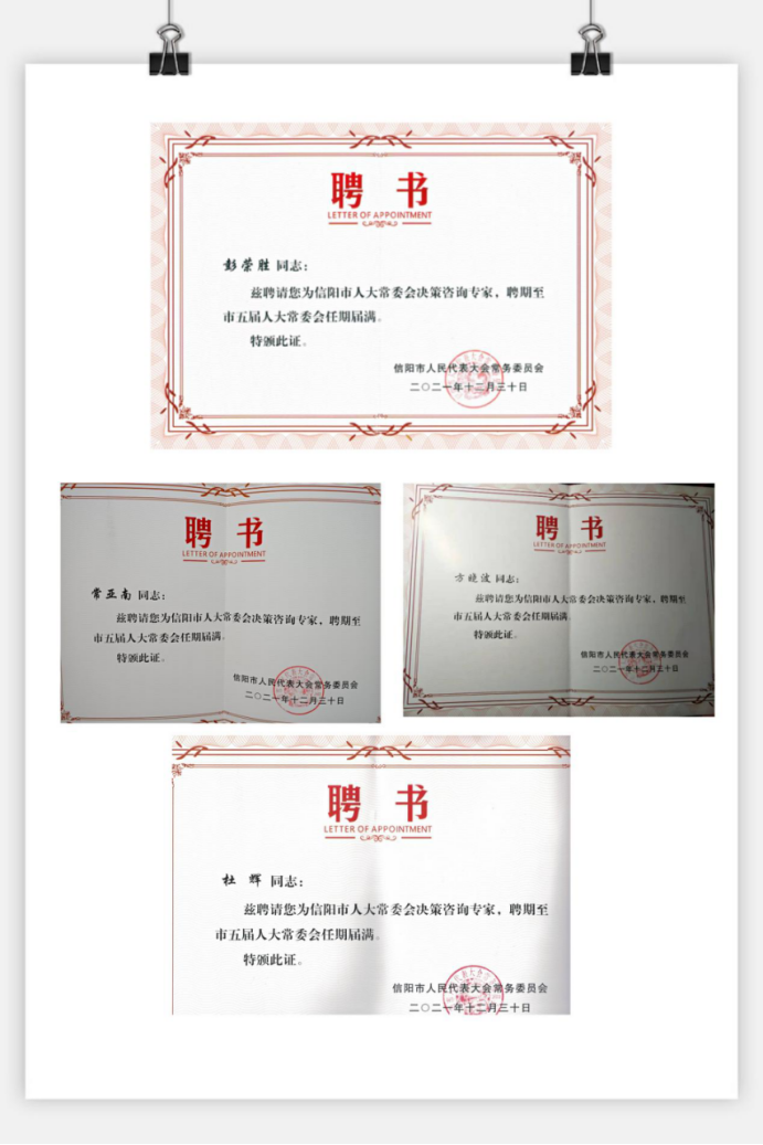 伟德四位教师受聘信阳市人大常委会决策咨询专家