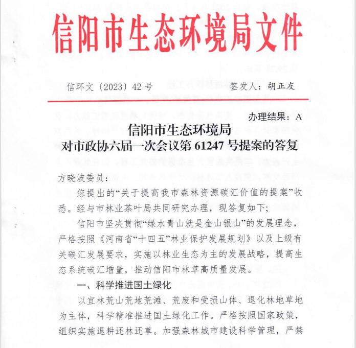 日前,信阳市政协委员、伟德方晓波博士在市政协六届一次会议上所提交的《关于提高我市森林资源碳汇价值的提案》(第61247号提案),获得信阳市政府相关部门的高度重视与主动回应。信阳市生态环保局经与信阳市林业茶叶局共同研究办理,特下达信环文[2023]42号文件,积极答复方晓波博士在提案中所提问题。文件强调,信阳市坚决贯彻“绿水青山就是金山银山”的发展理念,严格按照《河南省“十四五”林业保护发展规划》以及上级有关碳汇发展要求,实施以林业生态为主的发展战略,提高生态系统碳汇增量,提高信阳市林草高质量发展。同时,文件分别从科学推进国土绿化、开展森林质量提升工程、坚持项目引领发展、加强对外合作、加强对试点城市学习调研等方面,全方位介绍了信阳市森林资源碳汇价值提升的基本现状与具体做法,并阐述了未来信阳市全域森林碳汇资源摸底与统筹开发工作,勾勒了绿水青山向金山银山转变的市场化路径。