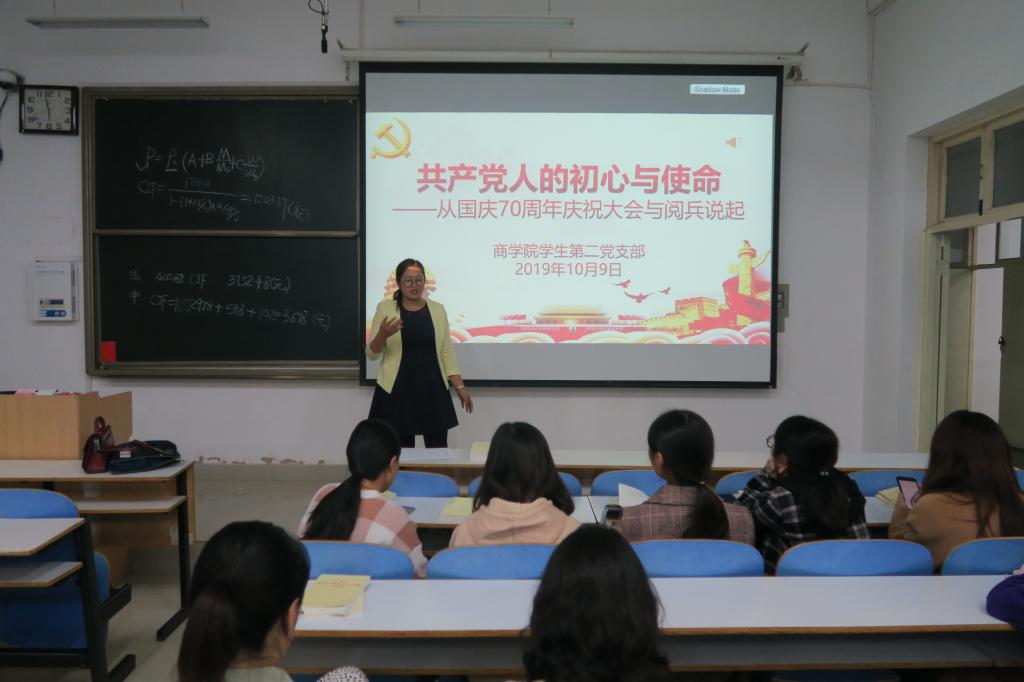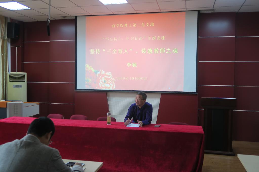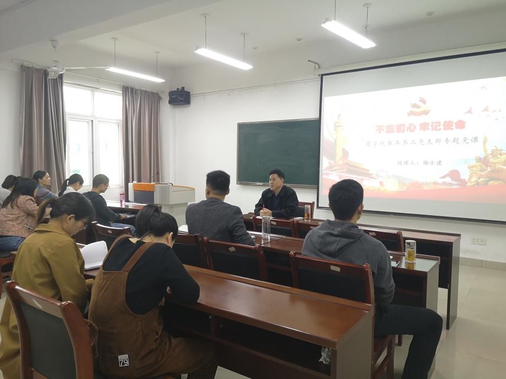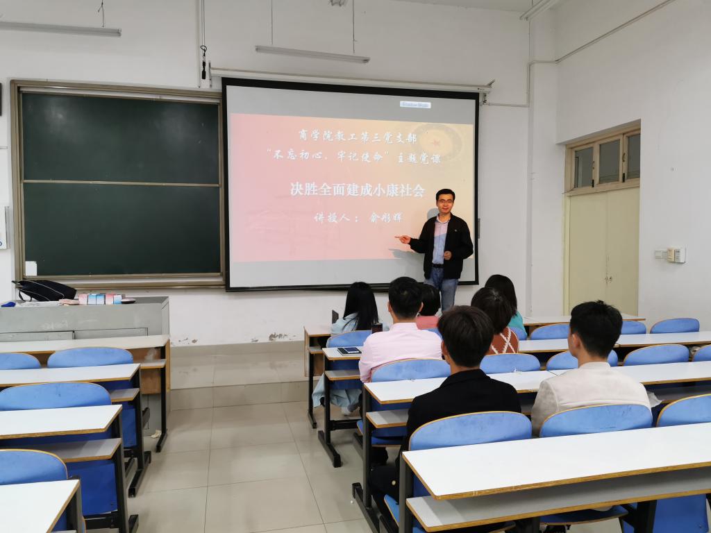二是“双带头人”支部书记积极为支部党员讲党课。“双带头人”支部书记依托专业优势,结合科研,教学、扶贫等工作开展专题党课活动。教工第三党支部书记俞彤晖以《不忘初心、牢记使命、决胜全面建成小康社会》为支部党员,教研室成员做了一场精彩的主题党课报告。