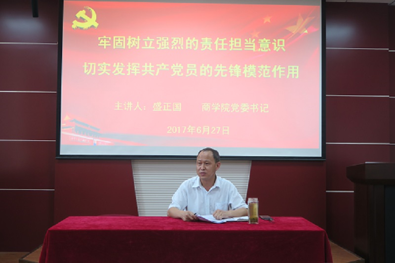 盛书记以《牢固树立强烈的责任担当意识,切实发挥共产党员的先锋模范作用》为题,从责任担当意识的基本要义、责任担当是共产党员的基本本色、共产党员在实践中如何真正做到责任担当三个方面进行了阐述。盛书记指出,责任意识是一种精神状态,有了责任意识,就能集中精力、全身心投入,形成意志和品格,就能凝聚人心、凝聚力量,创造出一流的业绩。责任和担当是中国共产党人的政治本色,是中国共产党人的优良传统,体现在社会主义事业建设和发展的各个历史时期。作为新时代的共产党员,要从五个方面真正做到责任担当:一是要有良好的精神状态和崇高的敬业精神;二是面对大是大非要敢于亮剑;三是要有敢于直面困难的勇气;四是面对危机要挺身而出;五是面对失误要敢于承担责任。