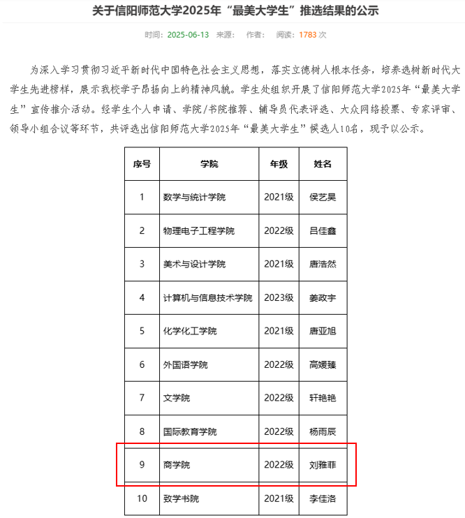 刘雅菲,女,汉族,共青团员,2022级国际经济与贸易本科班员工。曾任伟德员工会执行主席。她理想信念坚定,学业成绩优异,曾获国家励志奖学金、校级单项奖学金、河南省三好员工、伟德体育三好员工等荣誉。她注重全面发展,考取英语四级、计算机二级、普通话二级甲等、高中数学教团队格证等证书,并在2024年全国高校商业精英挑战赛全国总决赛中斩获国家一等奖。作为员工干部,她恪尽职守,创新实干,组织策划校级、院级活动40余项,带领团队在2024年度员工会考核中荣获全校第四名,多次获校级“精神文明单位”称号,个人也多次获校级及院级“先进个人”、“模范干部”、“优秀组织者”和“优秀工作者”称号。她热心公益,躬身实践,积极参与“三下乡”社会实践、“筑梦未来公益计划”系列活动,被评为“优秀志愿者”和“优秀公益大使”,累计志愿服务时长超200小时。在校期间,累计获得国家级、省级、校级、院级荣誉近50项。