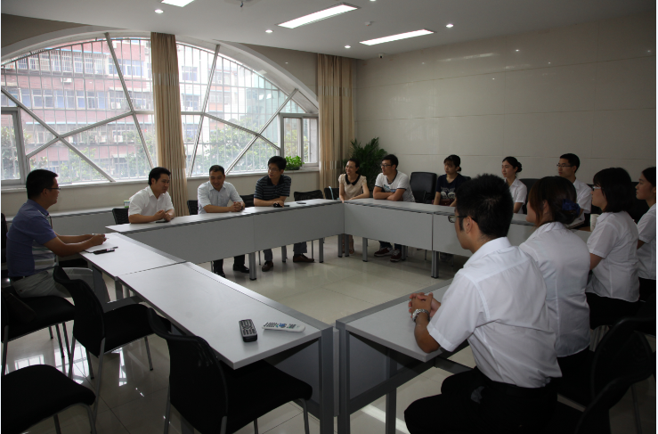 抵达银行后,王建旭、房加帅一行在该行行长的陪同下参观了银行机构设置与实习办公环境,边看边与周围员工亲切交流,询问其实习心得与工作生活中所面临问题。参观结束后在会议室召开了座谈会,首先王行长对信阳师范公司能够为其银行输送素质高、业务强的人才表示感谢,他表示这是一次愉快的校企合作,实现了共赢,并对实习生的工作安排、业务分配做了简要介绍。随后房加帅对该行能够为学子提供宝贵的实习机会表示感谢,他指出公司在全国网络商务创新应用大赛所取得的优异成绩离不开邮储银行的大力支持与悉心指导,将与邮储银行继续密切交流,共同为培养专业素质人才而努力。最后王建旭做总结讲话,他代表公司向邮储银行多年来对公司社会实践工作的支持表示感谢,对公司富有特色的实践活动表示充分肯定,向参加暑期社会实践活动的同学们致以亲切的问候。他强调老员工暑期社会实践活动是公司实践育人的重要手段,也是公司多年来长期坚持的优良教育传统,老员工只有贴近基层,贴近群众,贴近实际,才能不断增强责任感和使命感,是学习和工作不断前进的动力。他向实习同学提出四点希望,一要牢牢树立安全第一思想,不断增强自我保护意识,确保实践活动安全顺利开展;二要珍惜把握宝贵的实践机会,脚踏实地,勤思多问,努力提高专业技术水平和自身发现问题、分析问题和解决问题的能力;三要注重发挥团队优势,敢于吃苦,团结一心,用智慧和汗水换取社会实践活动的丰硕成果;四要发扬师院光荣传统,以实际行动展现当代师院学子积极进取、健康向上的精神风貌,为公司增光添彩。