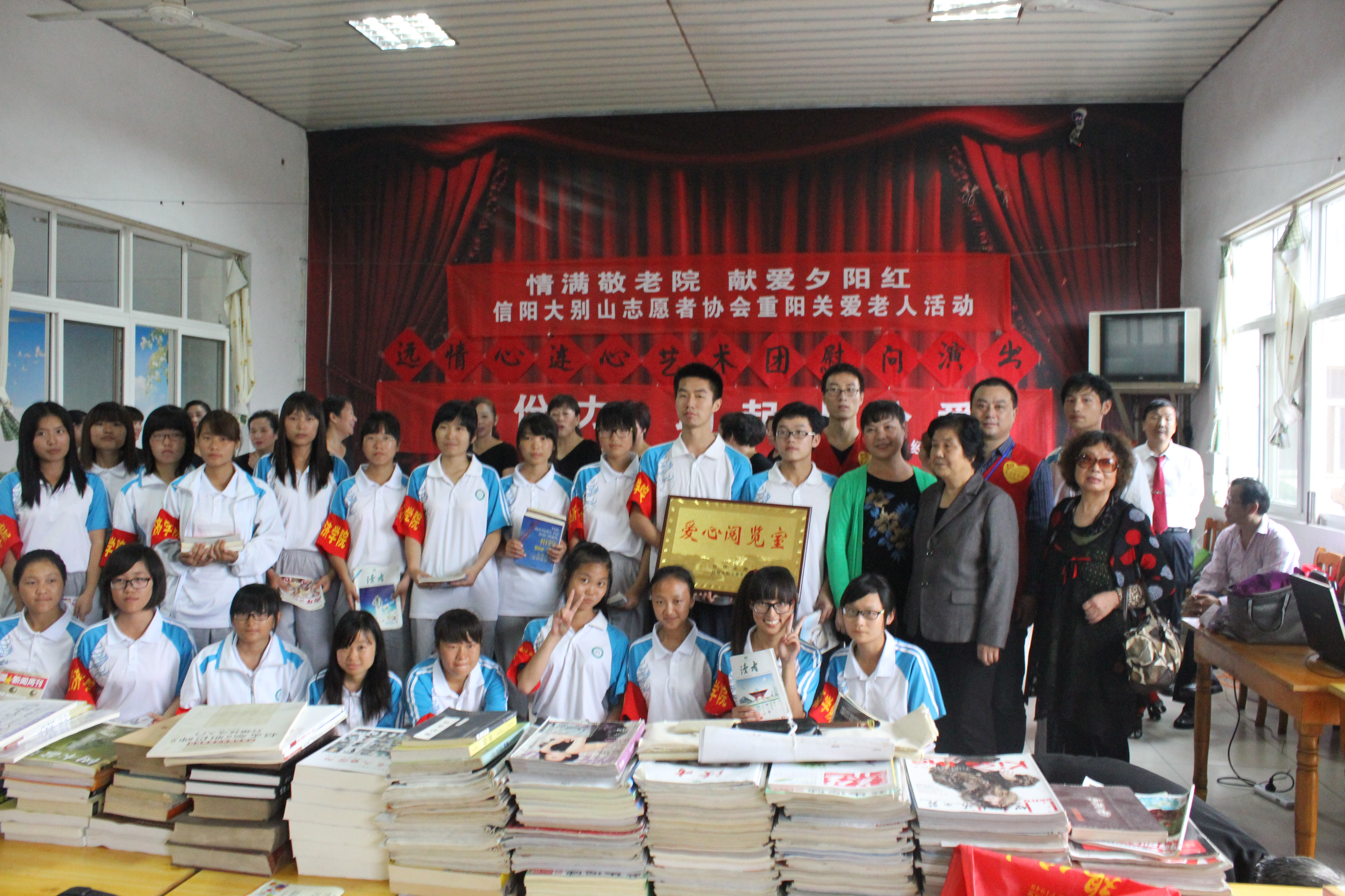 首先,志愿者们带着水果和糕点来看望老人,为他们送上了精心准备的健康知识小卡片与祝福信,随后志愿者分为三组为老人们按摩、梳头、剪指甲、打扫房间、搬东西、洗衣服,并耐心地与老人交流,共同回忆祖国的发展历程。现年92岁参加过红军的彭作炳老人给大家讲述了那段令他难以忘怀的铮铮岁月,他说:“解放军是一支正义之师,起义是我这辈子做得最好选择。”老人说完脸上露出一丝欣慰的笑容。同学们认真记录,不时提出问题,气氛祥和温馨。紧接着同学们献上了精彩的表演,经典的戏曲演唱让老人们听得津津有味并轻轻附和,整个演出现场气氛热烈。演出结束后同学们为敬老院献上了通过爱心募捐得来的书籍,希望能够丰富一下老人们的生活,提高他们的生活情趣,最后志愿者们与老人合影留念,不舍离去。