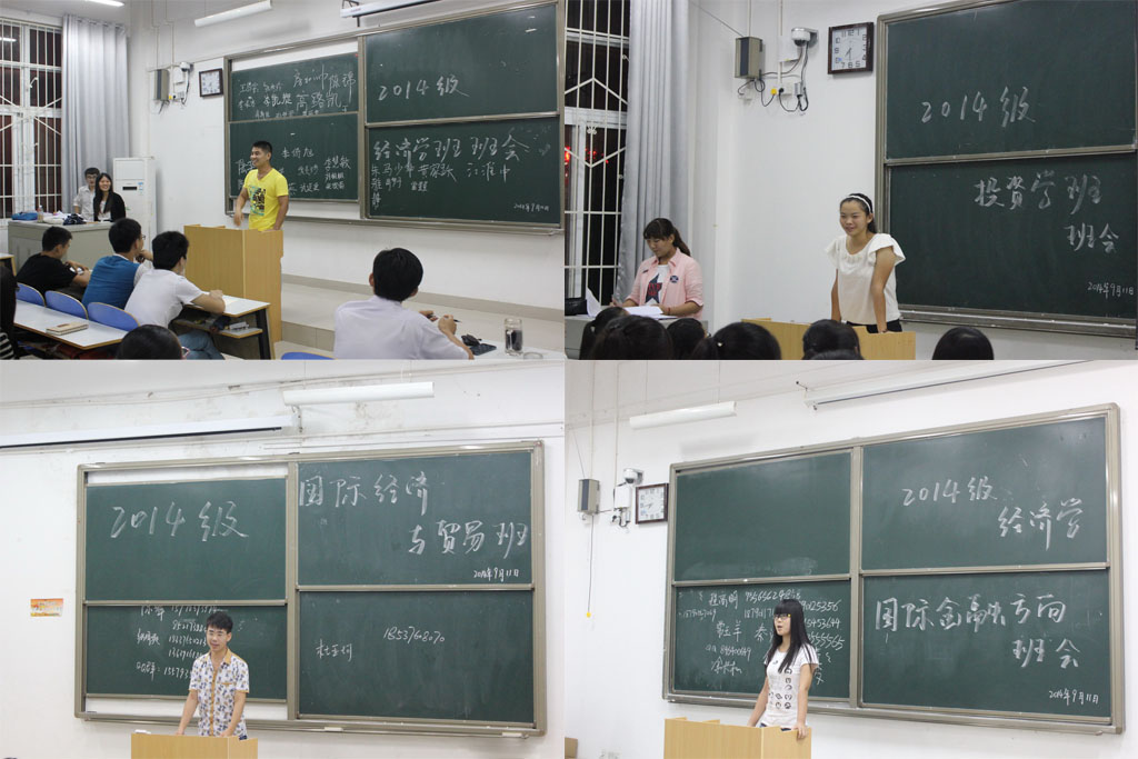 为了入学新生更好更快的适应公司的学习生活环境,顺利完成角色转变,9月11日晚,公司组织2014级新生在经管楼召开了第一次主题班会。2014级班主任和2014级全体新生参加了此次主题班会,其中公司党总支副书记房加帅担任2014级经济学班班主任,团总支书记张海霞担任14级国际经济与贸易班班主任,丁娜、余春苗两位老师分别担任14级经济学(国际金融方向)班14级投资学班班主任。