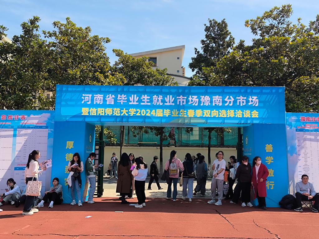 本次洽谈会吸引了包括润氏电商、中国人寿信阳第二收展部、中信保诚人寿信阳中支银行保险部等来自全国各地的近百家企业和用人单位参加,提供了涵盖教育、营销、人力资源、行政办公室、计算机IT等多领域就业岗位,豫南地区10余所高校近万名毕业生参加。双选会会场入口处设置参会企业、毕业生生源信息一览表和会场导视图,毕业生可通过扫码查看用人单位简介、招聘要求、岗位需求、企业展位等相关信息,用人单位则可根据招聘专业需求对接相关公司,实现与毕业生精准对接。双选会现场正中央设置一站式便捷服务台以提供简历打印、就业政策咨询、手续办理等服务,促进了现场招聘的便利化、高效化。另外,双选会现场还安排了老员工志愿者”一对一〞对接用人单位需求,提高服务质量。