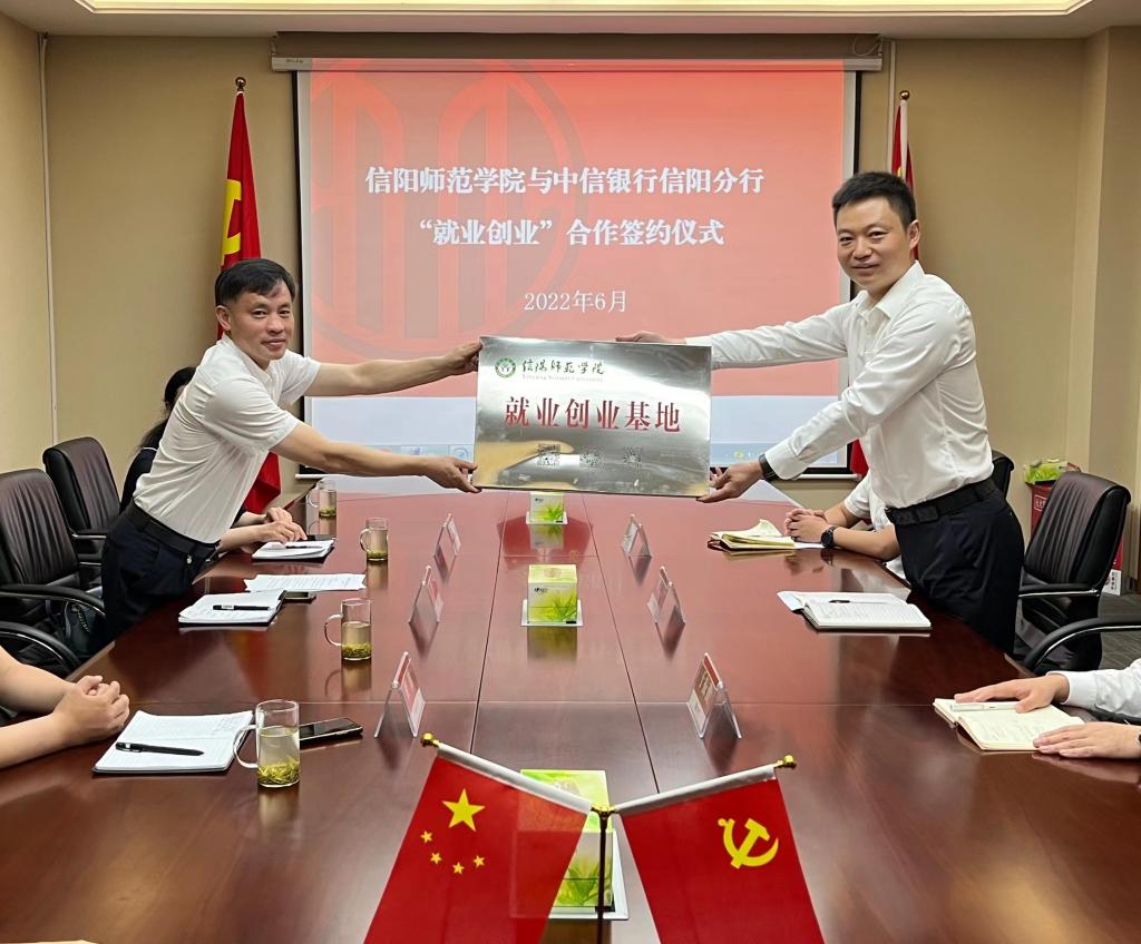 在中信银行信阳分行,行长邢云涛介绍了中信银行的基本情况,对伟德在去年的校园招聘中给予的支持表示感谢,也希望伟德能一如既往地为中信银行输送优秀人才。彭荣胜对中信银行招聘公司优秀毕业生、为公司员工提供实习岗位表示感谢,介绍了伟德专业建设、人才培养和毕业生就业等情况。双方就人才培养、教学科研、实习就业、产学研合作等进行了深入洽谈,签署了校企合作协议,并举行了就业创业基地揭牌仪式。