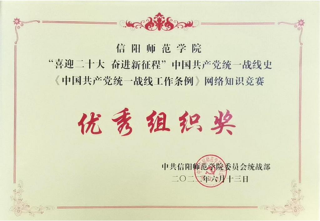 根据中共河南省委统战部、公司党委统战部的统一部署,公司党委认真组织师生参加信阳师范公司“喜迎二十大 奋进新征程”中国共产党统一战线史和《中国共产党统一战线工作条例》网络知识竞赛,参与答题1206人次,获奖人数1081人,荣获优秀组织奖。